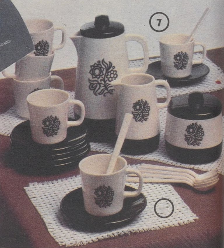 Magnet 1988–1989 str. 127 / obj. č. 135262 Kčs 36.–,– Čajový servis obsahuje šest šálků s podšálky a lžičkami, konvici, cukřenku a konvičku na mléko. Servis je z plastické hmoty. výška: výrobce: designer: vyráběno od: