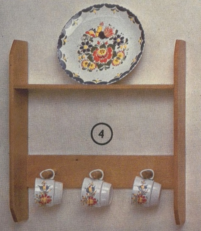 Magnet 1981–1982 str. 50 / obj. č. 999079 Kčs 210,– Dřevěná polička s malovaným talířem a hrnečky pro chalupářské prostředí. výška: výrobce: designer: vyráběno od: