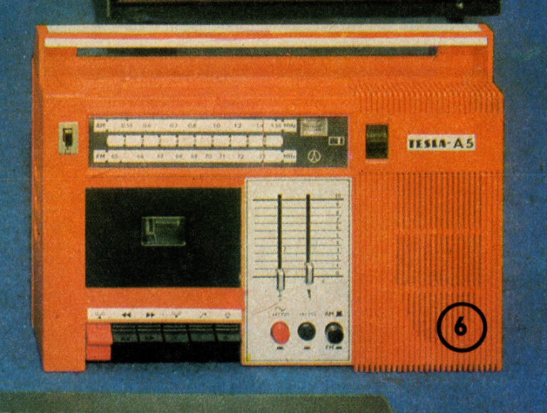 A 5 – – přenosný tranzistorový kazetový magnetofon A S v kabelovém provedení s vestavěným radiopřijímačem pro příjem pořadů na vlnnových rozsazích VKV a SV. Automatické dobíjení baterie při provozu ze sítě, možnost provozu ve svislé i vodorovné poloze, vestavěná feritová anténa a teleskopická anténa pro příjem VKV – to jsou charakteristické znaky této novinky československé výroby. Připojná místa pro gramofon, jiný radiopřijímač, magnetofon, mikrofon, sluchátka, zesilovač a vnější reproduktor. Elegantní tvar a kvalitní reprodukce hudby i řeči staví tento magnetofon mezi špičkové výrobky na našem trhu. Rychlost posuvu pásku 4,76 cm, 2 stopy, možnost použití kazet C 60, 90 i 120. Rozměry magnetofonu 34x19x8 cm. Možnost napájení ze sítě 220 V, vnější zdroj 9-15 V (autobaterie nebo 6 monočlánků), váha 3,5 kg.