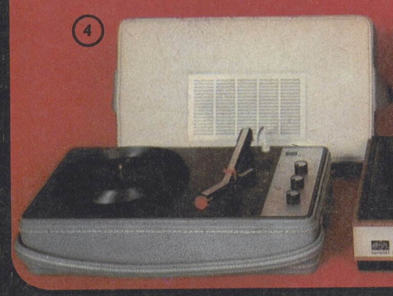 Kufříkový gramofon GE 071 Magnet 1973-1974 str. 78 / obj. č. 408015 Kčs 1010,– Kufříkový gramofon GE 071 – moderní třírychlostní přenosný přístroj s monošasím a celotranzistorovým monozesilovačem. Ramínko přenosky je z plastiku, reproduktor vestavěn do víka. Kufřík koženkový. výška: výrobce: designer: vyráběno od: