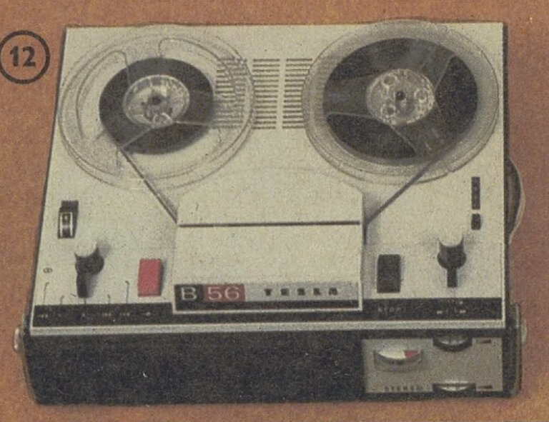 Magnetofon B 56 – moderní čtyřstopý jednorychlostní magnetofon pro stereozáznam spojuje všechny přednosti magnetofonů Tesla a zaručuje dokonalý poslech hudebních programů. Tech. data: rychlost posuvu pásku 9,53 cm/sec, kmit. rozsah 50-1500 Hz, příkon 27 W.