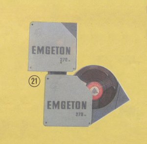 Magnetofonová páska EMGETON 270 mm Magnet 1968–1969 str. 31 / obj. č. 425002 Kčs 63.–,– Magnetofonová páska EMGETON 270 mm pro kvalitní dvoustopý záznam na magnetofonech typu Sonet. výška: výrobce: designer: vyráběno od:
