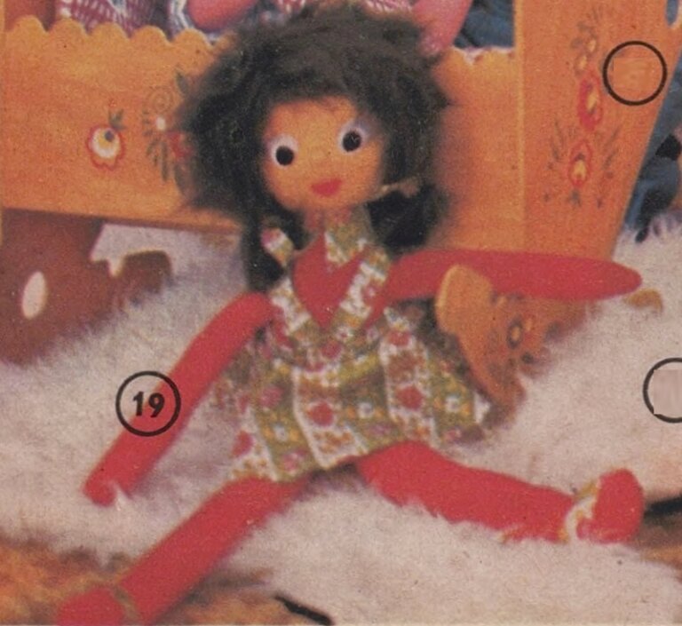 Panenka Cilka Magnet 1978–1979 str. 63 / obj. č. 125027 Kčs 53 Panenka Cilka je dlouhá 52 cm, celá zhotovena z textilu, vlásky má z leskyma. výška: výrobce: designer: vyráběno od: