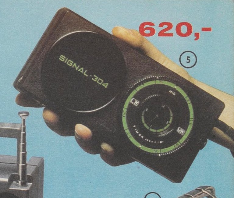 SIGNÁL 304 Magnet 1989–1990 str. 45 / obj. č. 282044 Kčs 620 SIGNÁL 304 – rozhlasový přijímač s rozsahem DV a SV. Zabudovaná feritová anténa a hodiny, zásuvka pro vnější anténu a sluchátka. Rozměry 162 x 85 x 46 cm, napájení 9V baterií. výška: výrobce: designer: vyráběno od: