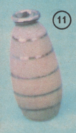 Vázička se zúženým hrdlem a kruhy po obvodu. Keramické vázičky různých tvarů a dekorů mají velikost mezi 13 a 15 cm. NOVINKA. Magnet 1976–1977 str. 127 / obj. č. 511045 Kčs 27,– 76-125-511045 výška: výrobce: designer: vyráběno od: